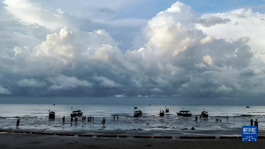 清晨,迅速變化的光線(xiàn)和云彩、來(lái)來(lái)往往的游客、聞雞起舞的漁人以及奔騰不息的波浪,在廣西東興的金灘上一起奏響了一首美妙的樂(lè )曲。