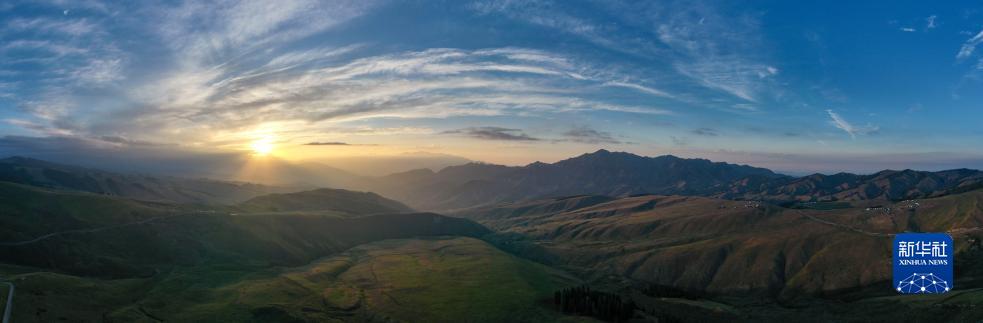 夕陽(yáng)映照下的新疆昌吉市廟爾溝鄉索爾巴斯陶牧場(chǎng)(8月13日攝,無(wú)人機全景照片)。