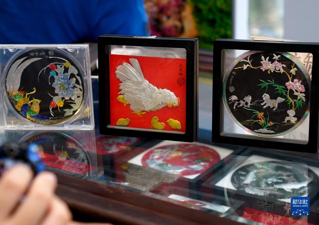 藝術(shù)節現場(chǎng)展示的用易拉罐創(chuàng )作的環(huán)保手工作品(8月15日攝)。