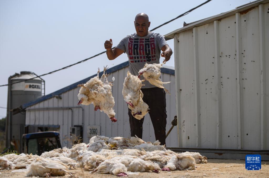 8月14日,在以色列北部馬爾加利奧特村一養雞場(chǎng),一名男子處理熱死的雞。