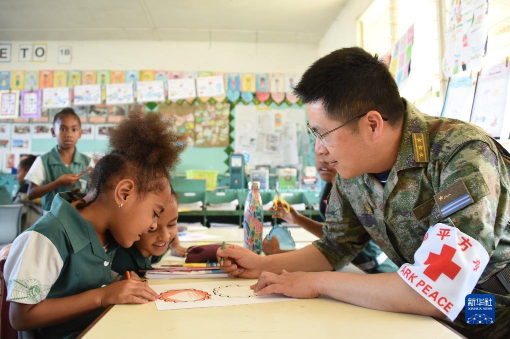 8月11日,中國海軍“和平方舟”號人員在瓦努阿圖一所學(xué)校同學(xué)生一起畫(huà)畫(huà)。