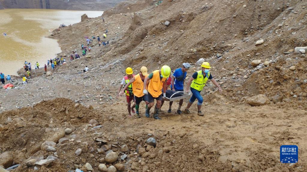 8月15日,在緬甸克欽邦帕甘鎮,救援人員在玉石礦場(chǎng)坍塌事故現場(chǎng)搜救到一名遇難者。