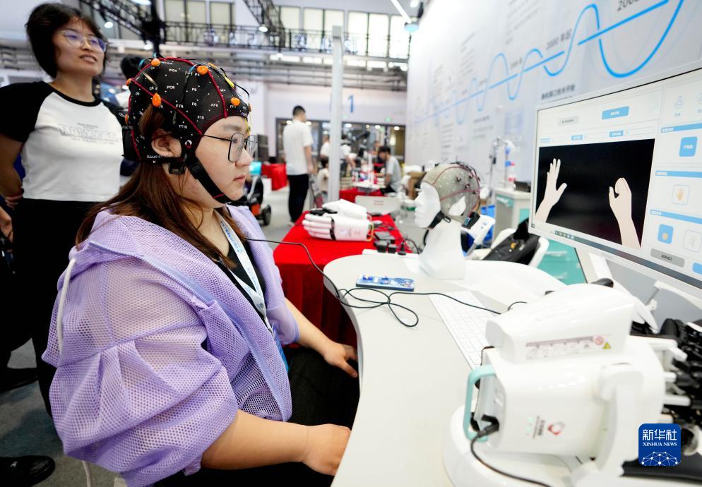 8月16日,工作人員在演示腦機接口智能治療系統平臺。該機器人應用于中風(fēng)患者手部康復治療。