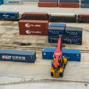 8月14日,在江西省贛州市南康家具智能備料中心,工作人員操作車(chē)輛運送木料。