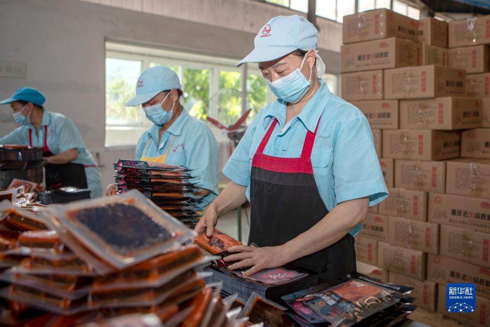 8月15日,重慶市石柱土家族自治縣龍沙鎮一家食品公司的工人在包裝車(chē)間給火鍋底料裝外袋。