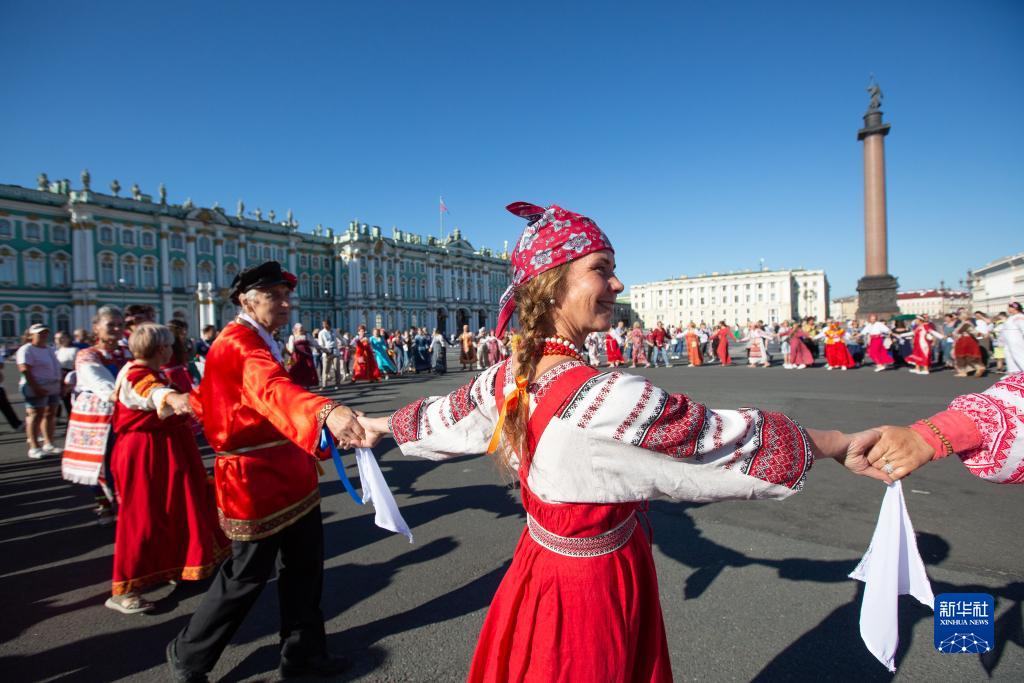 8月15日,民眾在俄羅斯圣彼得堡冬宮廣場(chǎng)跳圓圈舞。