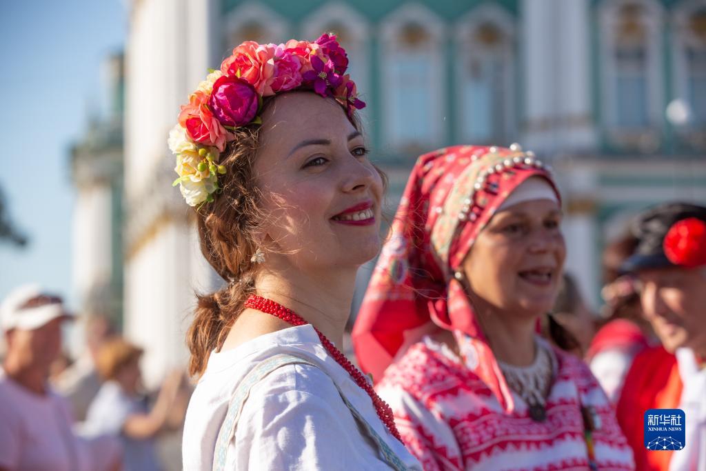 8月15日,民眾在俄羅斯圣彼得堡冬宮廣場(chǎng)跳圓圈舞。