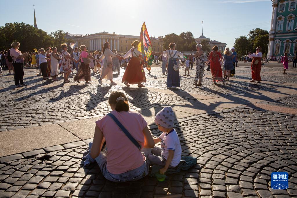 8月15日,在俄羅斯圣彼得堡冬宮廣場(chǎng),一對母子坐在跳圓圈舞的民眾旁。