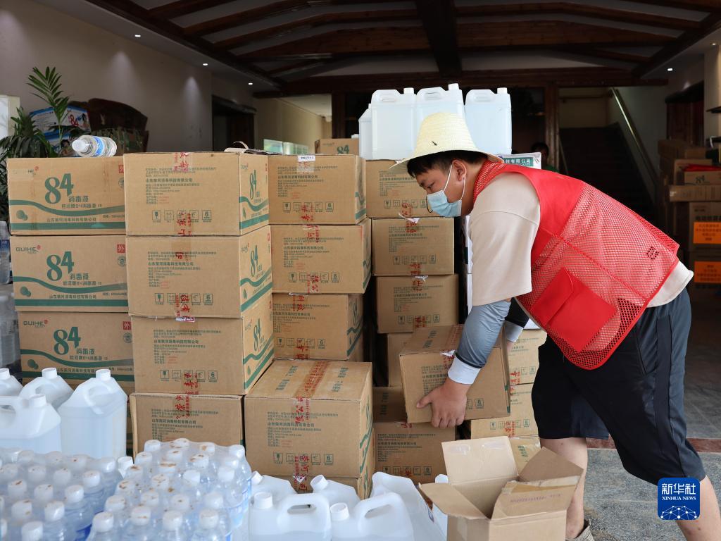 8月15日,工作人員在河北淶水縣三坡鎮防汛救災臨時(shí)指揮部搬運消殺物資。