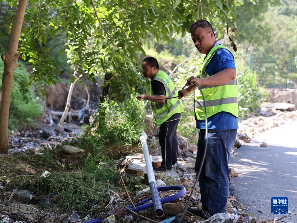 8月16日,通信公司施工人員在河北淶水縣九龍鎮大澤村搶修通訊設施。