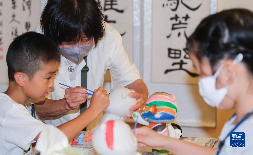 8月16日,在日本東京中國文化中心,人們制作屬于自己的彩色大熊貓玩偶。