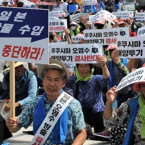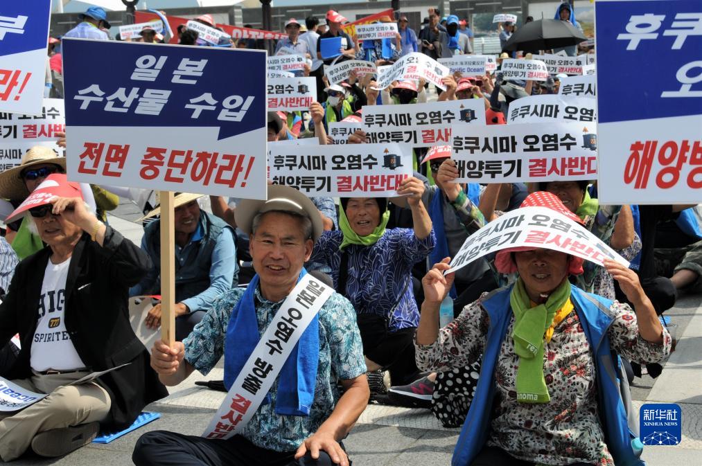 8月16日,在韓國全羅南道高興郡沿海一帶,韓國漁民手持標語(yǔ)參加集會(huì )活動(dòng),抗議日本核污染水排海計劃。