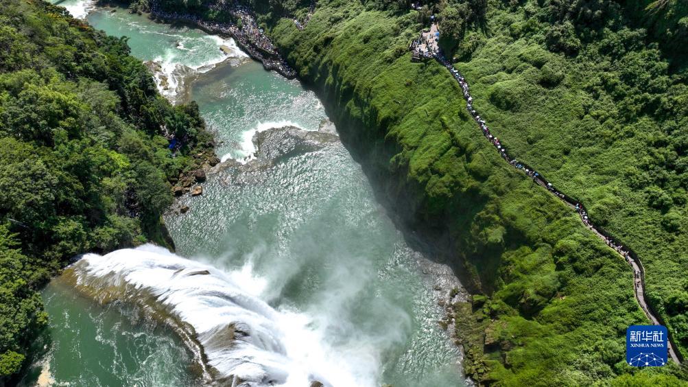 8月16日,游客在貴州省安順市黃果樹(shù)瀑布景區游覽(無(wú)人機照片)。