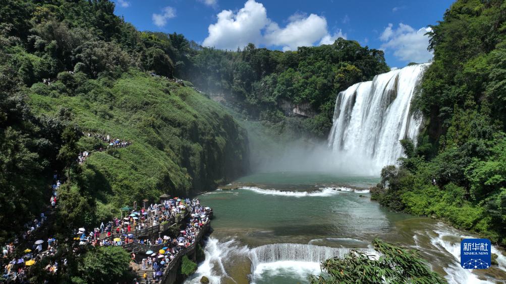 8月16日,貴州省安順市黃果樹(shù)瀑布景區游人如織(無(wú)人機照片)。