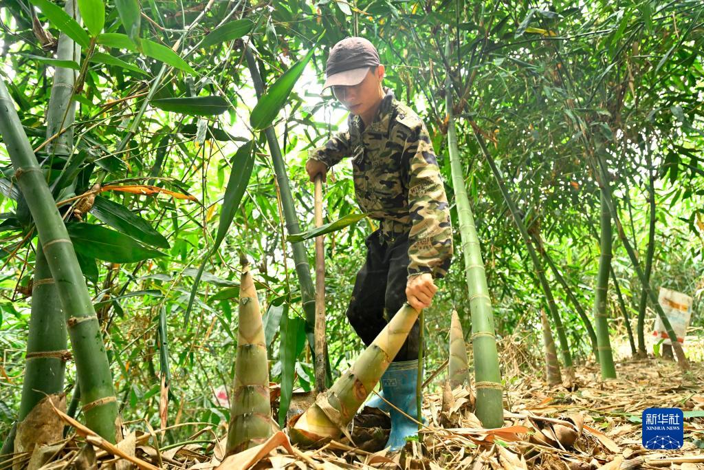 8月16日,在廣西柳州市柳城縣沙埔鎮古仁村,農民在竹林里挖筍。