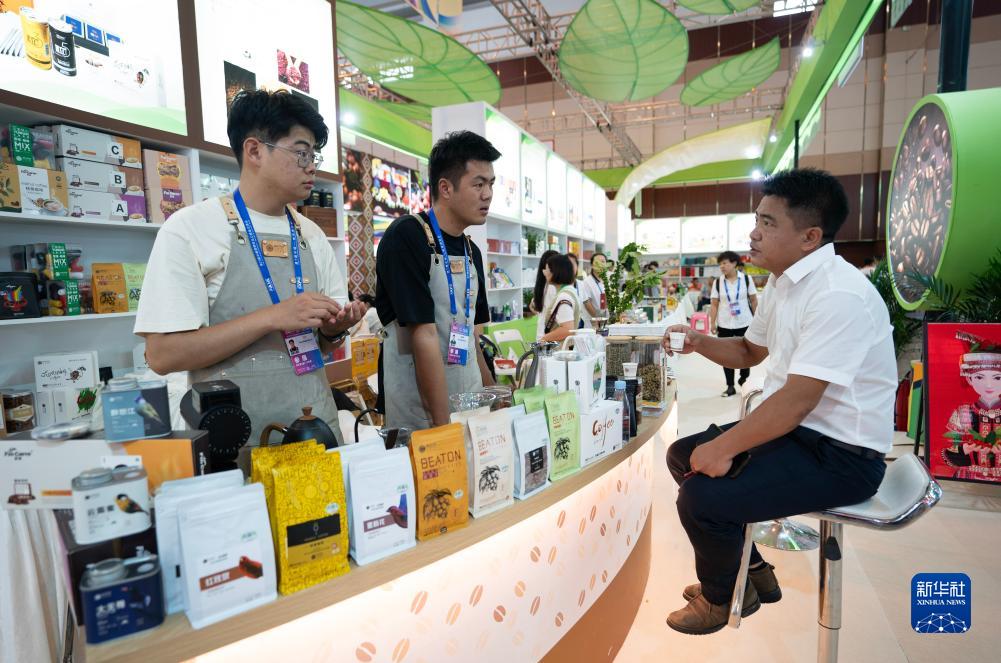 8月16日,來(lái)自云南保山的參展商在第七屆中國—南亞博覽會(huì )上向參觀(guān)者介紹咖啡產(chǎn)品?! ⌒氯A社記者 陳欣波 攝
