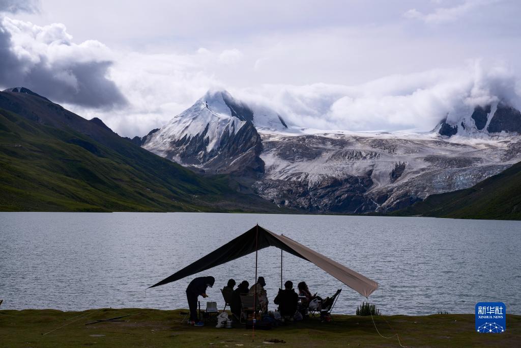 游人在薩普雪山下的湖邊欣賞景色(8月16日攝)。