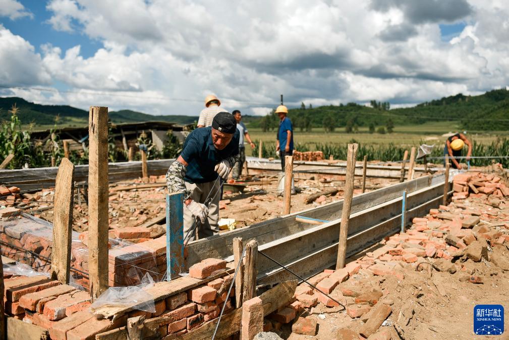 工作人員對舒蘭市開(kāi)原鎮模范村的受損房屋進(jìn)行重建工作(8月16日攝)。