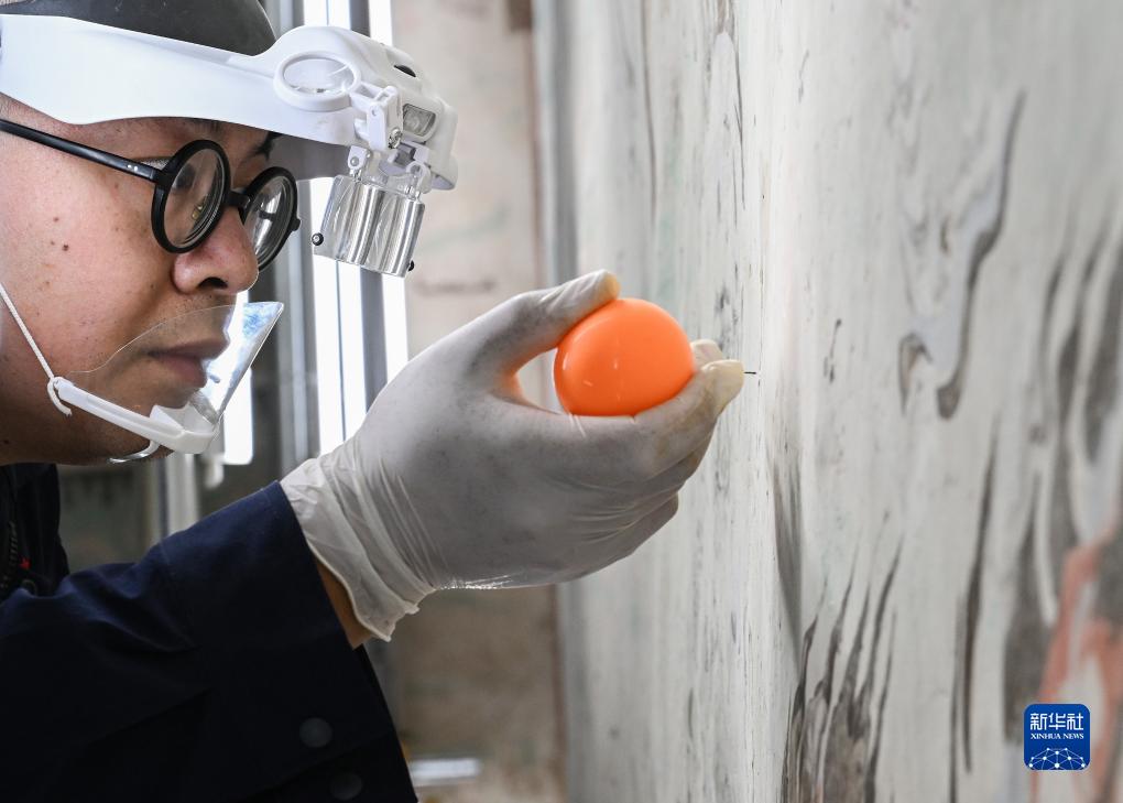 在敦煌莫高窟正在保護修繕的第55窟內,文保工作者對壁畫(huà)進(jìn)行加固修復(8月3日攝)。