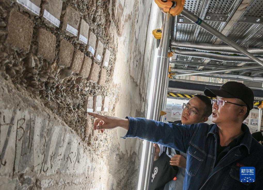 在敦煌莫高窟正在保護修繕的第55窟內,文保工作者對現場(chǎng)模擬試塊進(jìn)行對比測試(8月3日攝)。