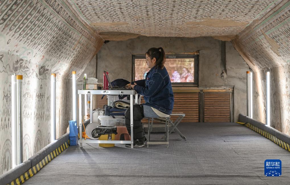 在敦煌莫高窟正在保護修繕的第55窟內,一位文保工作者對采集的數據進(jìn)行整理(8月3日攝)。