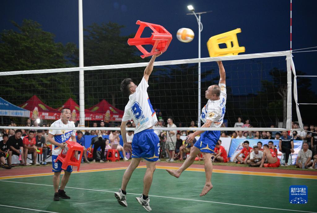 “村排”龍樓站賽間,球員們用凳子打排球,為觀(guān)眾表演具有文昌特色的“凳子排球”(7月1日攝)。