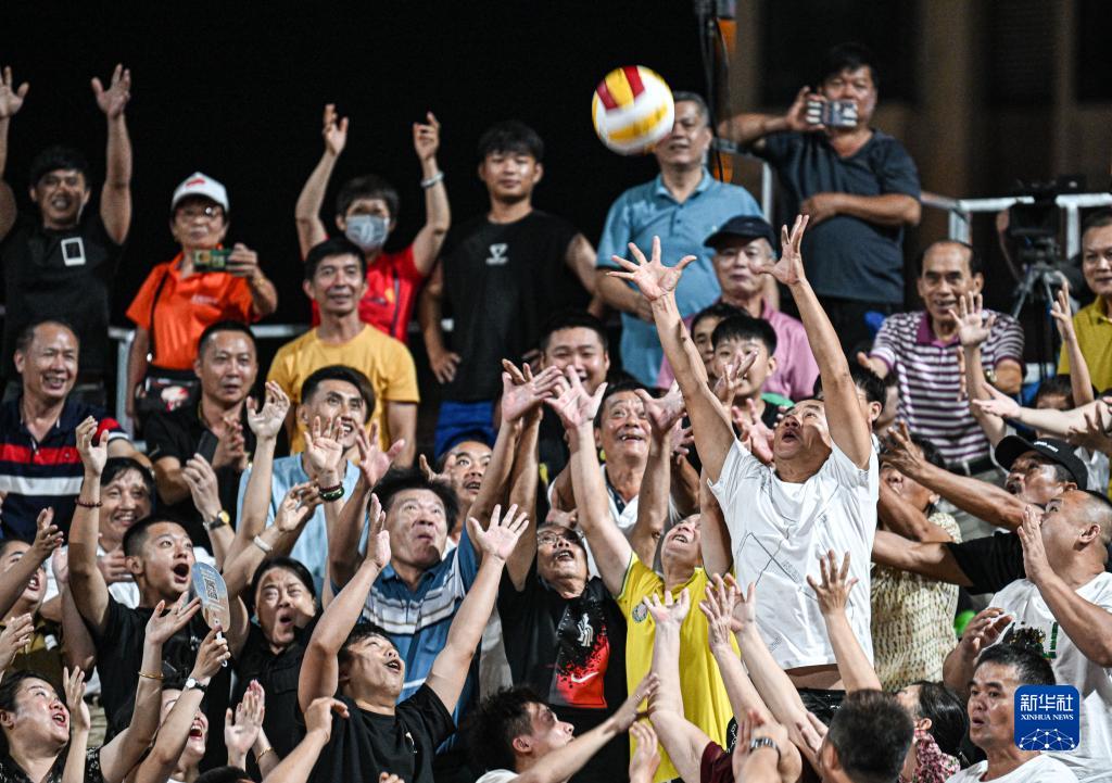 “村排”決賽現場(chǎng),觀(guān)眾在賽前互動(dòng)中爭搶前中國女排隊員魏秋月、李穎的簽名排球(8月13日攝)。