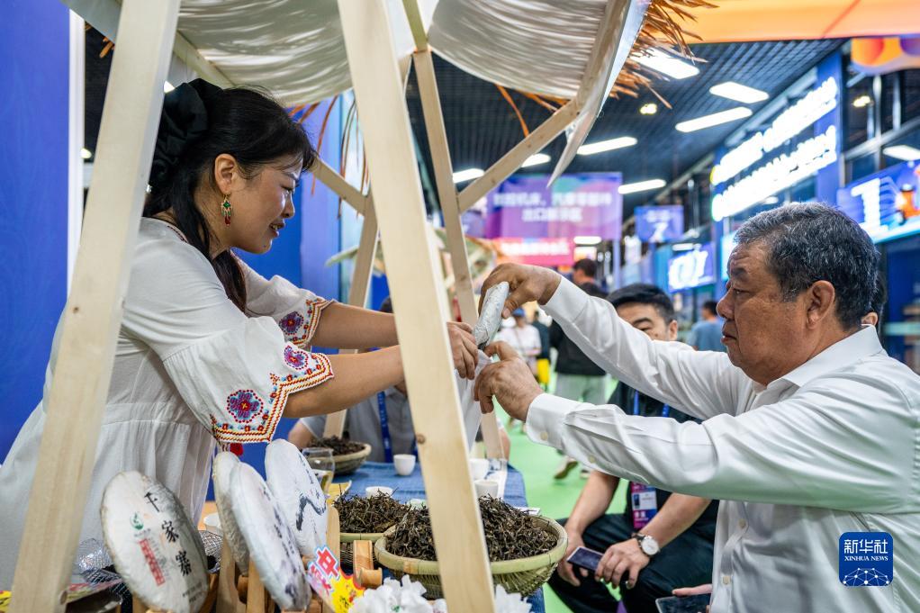 8月17日,消費者(右)在南博會(huì )首屆南亞茶葉節上購買(mǎi)茶葉。