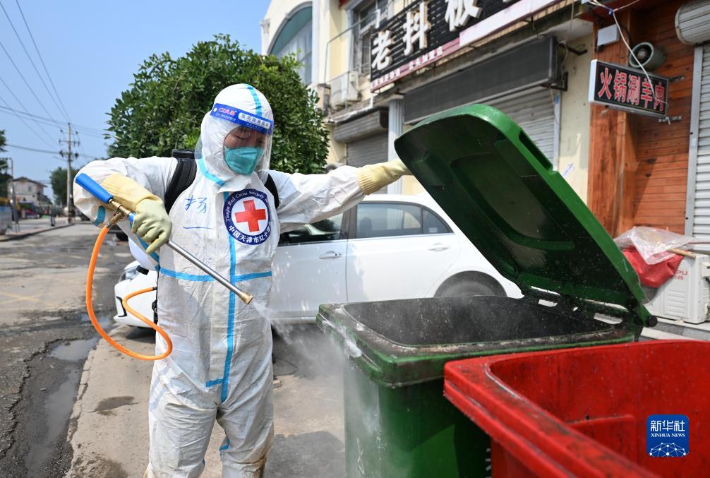 8月17日,工作人員在天津市靜海區臺頭鎮進(jìn)行消殺作業(yè)。