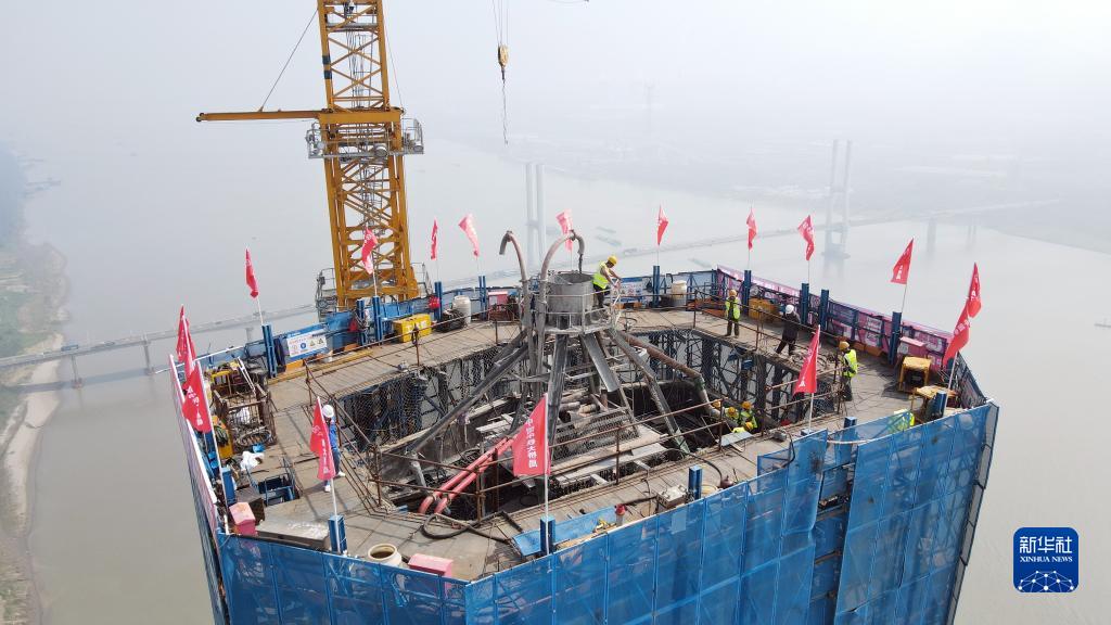 8月18日拍攝的京臺高速銅陵長(cháng)江公鐵大橋3號主塔封頂施工現場(chǎng)(無(wú)人機照片)。