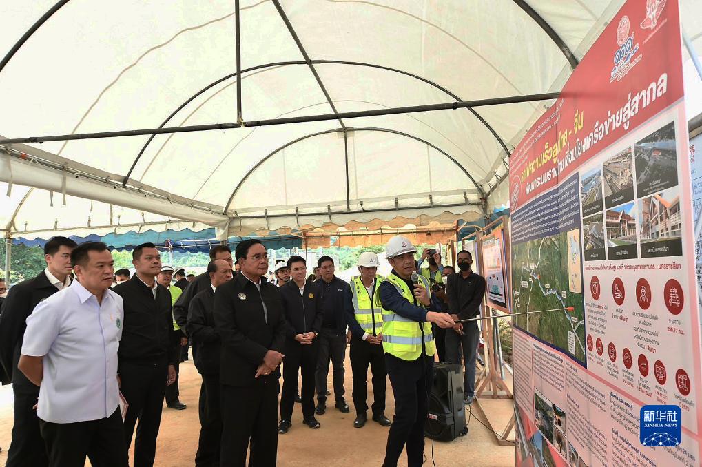 8月17日,泰國總理巴育(中)在沙拉武里府視察中泰鐵路施工段。