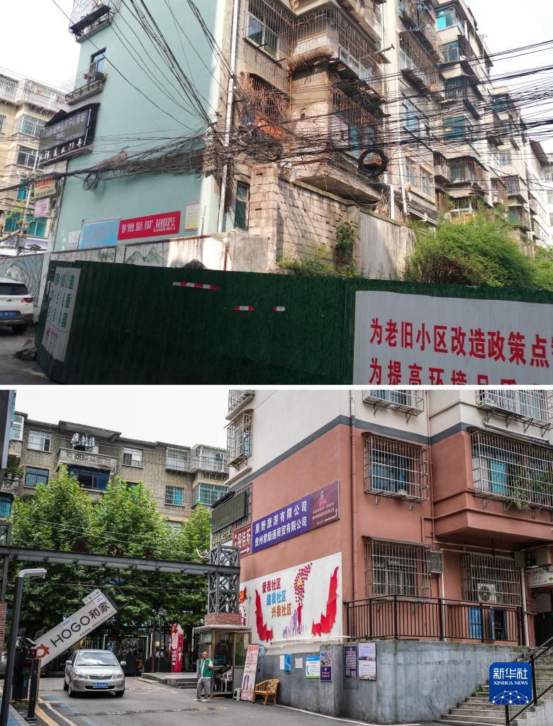 拼版照片:上圖為改造前的六盤(pán)水市鐘山區黃土坡街道文明巷小區(資料照片);下圖為改造后的文明巷小區(8月17日新華社記者陶亮攝)。
