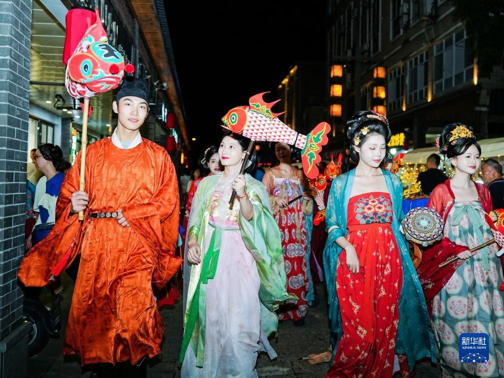 8月18日,在杭州市臨安區昌化鎮,游客身著(zhù)傳統服飾打卡“唐昌之夜”主題文化節。
