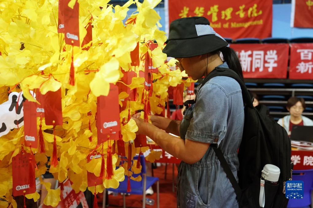 8月19日,在北京大學(xué)邱德拔體育館,一名光華管理學(xué)院的2023級本科新生將祝福語(yǔ)掛在“簽到樹(shù)”上。