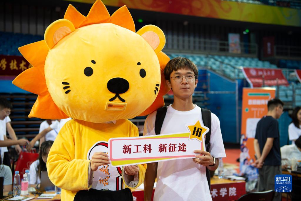 8月19日,在北京大學(xué)邱德拔體育館,一名新生在報到現場(chǎng)拍照留念。