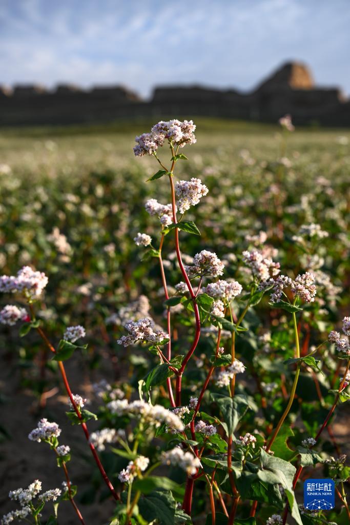 鹽池縣一處長(cháng)城腳下蕎麥花開(kāi)放(8月18日攝)。