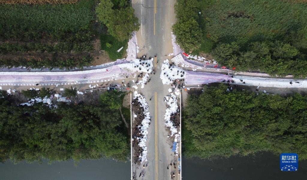 8月10日,武警第一機動(dòng)總隊某支隊官兵在大清河支渠橋處搶筑堤壩(無(wú)人機照片)。