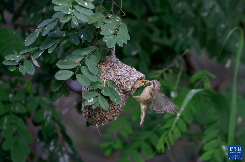 8月19日,一只中華攀雀成鳥(niǎo)在巢穴口給雛鳥(niǎo)喂食。