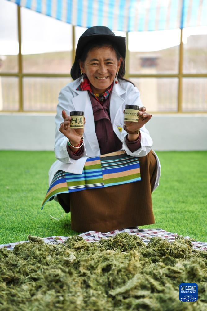 措勤縣高原生態(tài)畜牧業(yè)現代化養殖一體化產(chǎn)業(yè)綜合基地合作社社員展示產(chǎn)業(yè)園區特產(chǎn)——野蔥調味品(8月19日攝)。