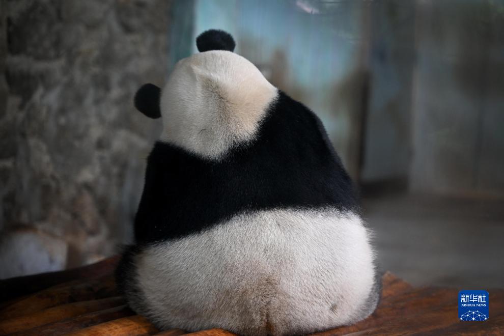 8月20日,大熊貓“舜舜”背對觀(guān)眾品嘗美食。