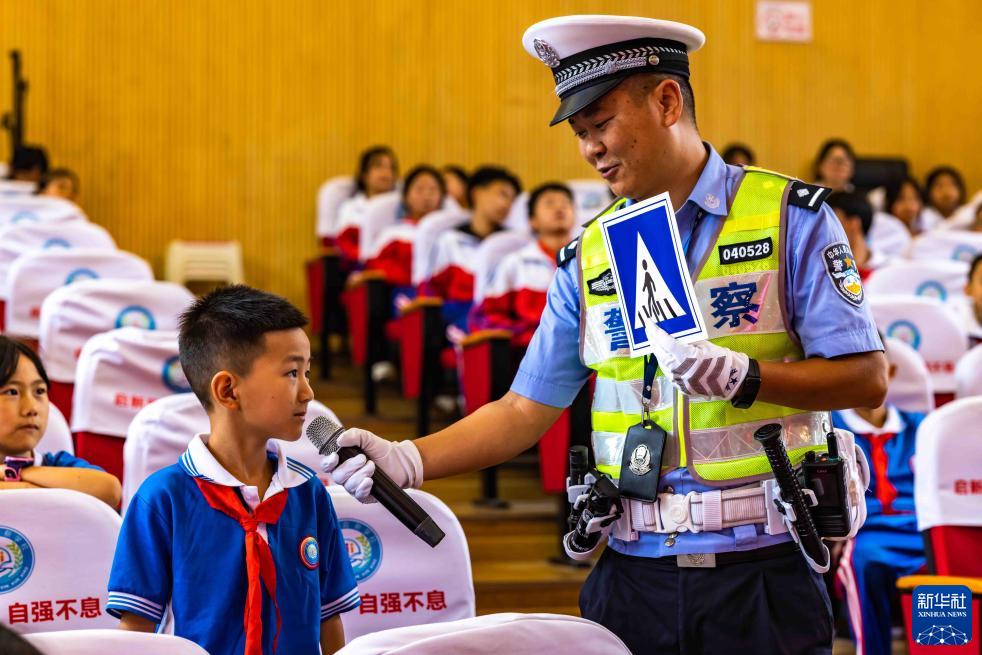 8月21日,交警在貴州省安順市西秀區啟新學(xué)校為學(xué)生講解交通安全知識。
