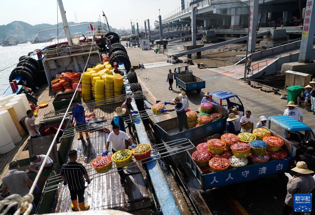 8月16日,在浙江省舟山市普陀區舟山國際水產(chǎn)城碼頭,工作人員從漁運船上卸下新鮮梭子蟹。新華社記者 韓傳號 攝