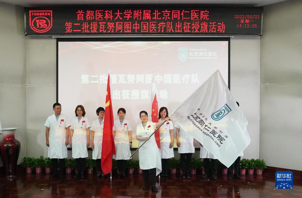 8月21日拍攝的北京同仁醫院第2批援瓦努阿圖中國醫療隊出征授旗活動(dòng)現場(chǎng)。