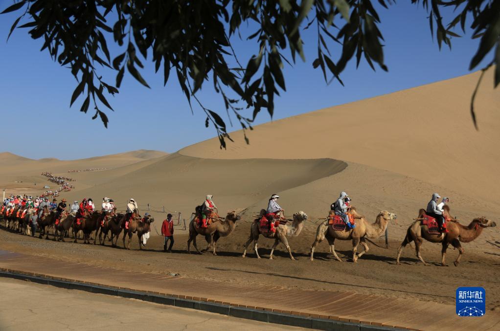 初秋時(shí)節,甘肅省敦煌市碧空如洗,鳴沙山月牙泉景區景色如畫(huà),引人入勝。