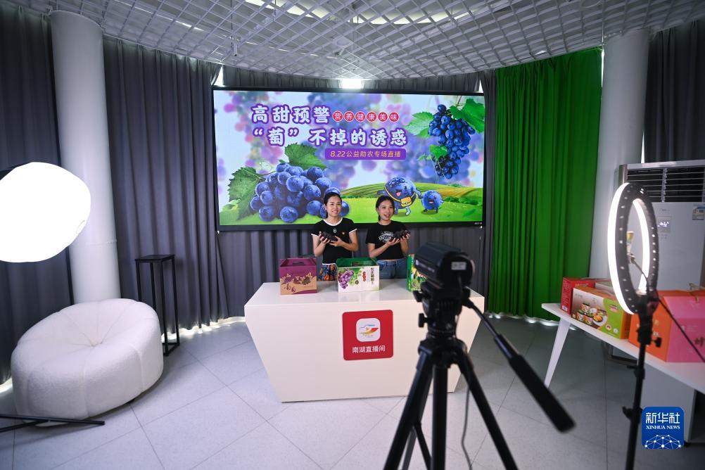 8月22日,黨員志愿者在嘉興市南湖區電商產(chǎn)業(yè)園的共富工坊直播間進(jìn)行葡萄助農直播銷(xiāo)售。