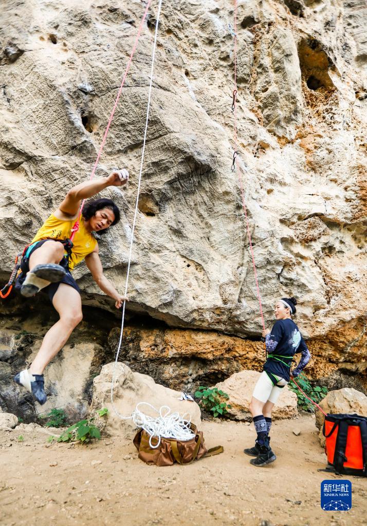 肖婷(右)對劉永邦進(jìn)行攀巖保護(2023年5月6日攝)。