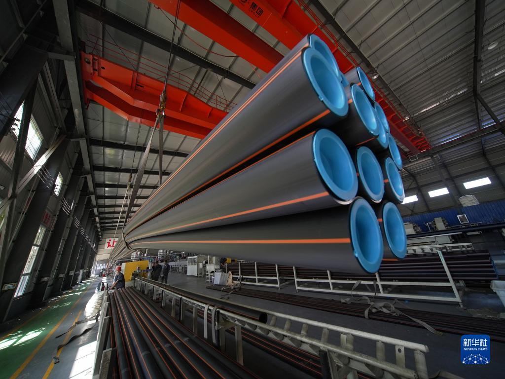 8月22日,工人在河北省滄州市孟村回族自治縣河北一塑管道制造有限責任公司聚乙烯管材生產(chǎn)車(chē)間進(jìn)行聚乙烯燃氣管材吊裝。