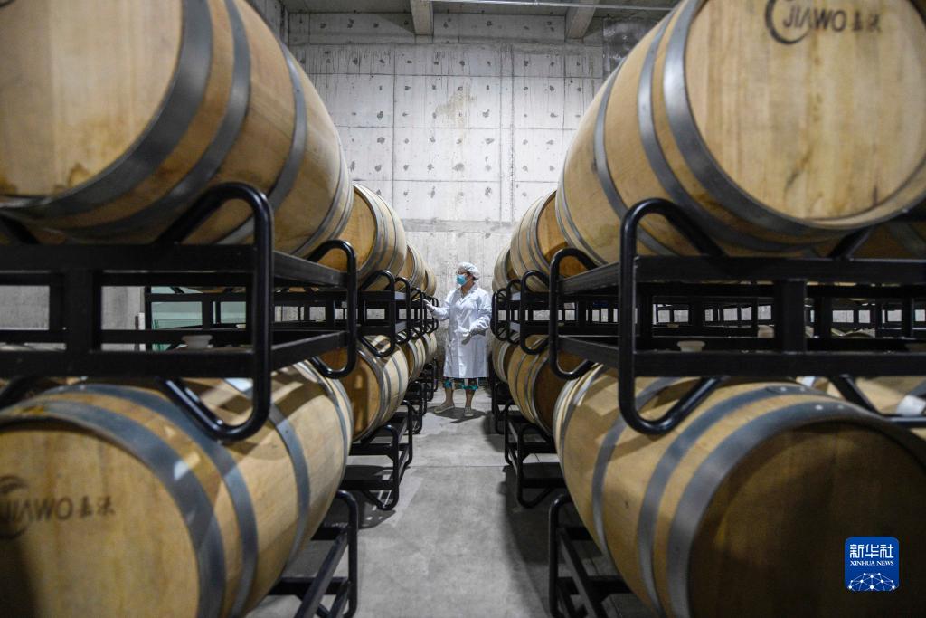 8月22日,在承德縣一家蘋(píng)果酒生產(chǎn)企業(yè),工人在存儲車(chē)間查看酒桶密封情況。