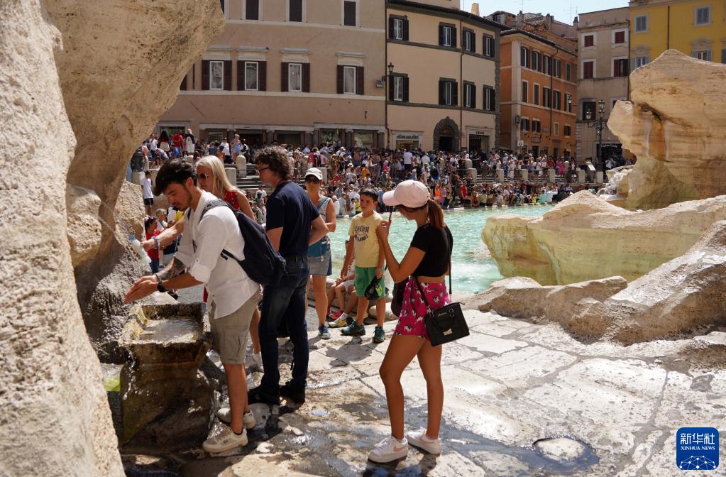 8月22日,人們在意大利羅馬許愿池附近的一處水龍頭接水。