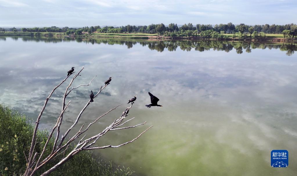 幾只鸕鶿在蘆河岸邊的樹(shù)梢上歇息(8月19日攝,無(wú)人機照片)。